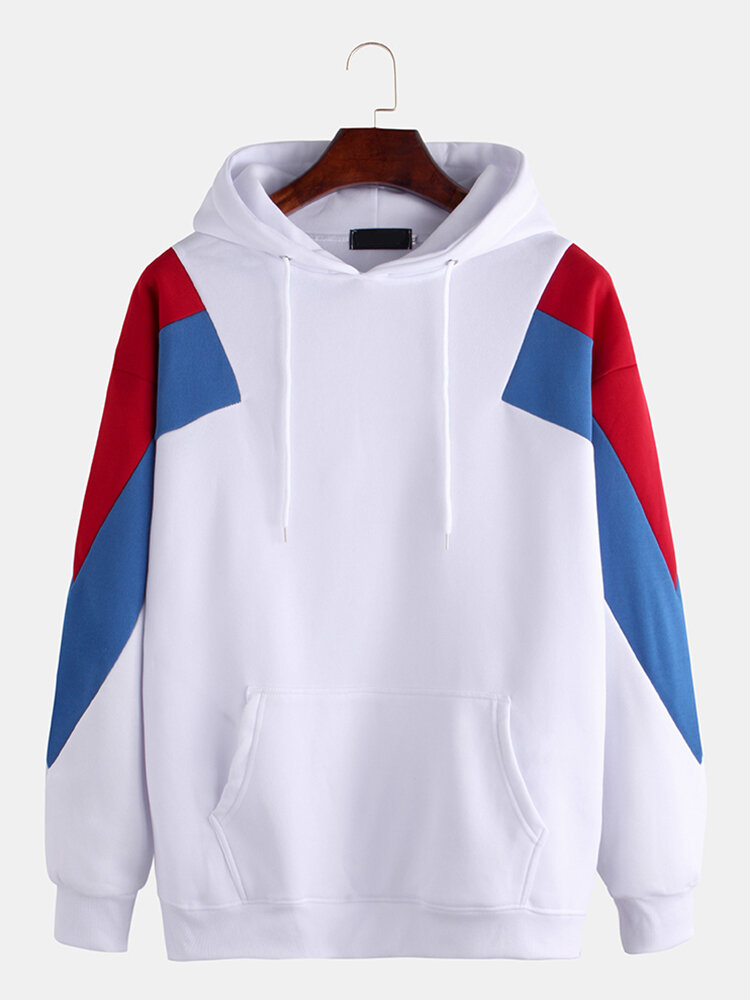 Mens Patchwork Color Printed Long Sleeve Hooded Sweatshirt – S White