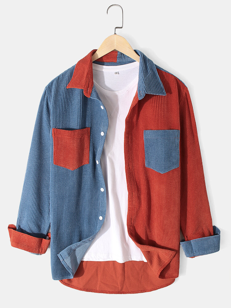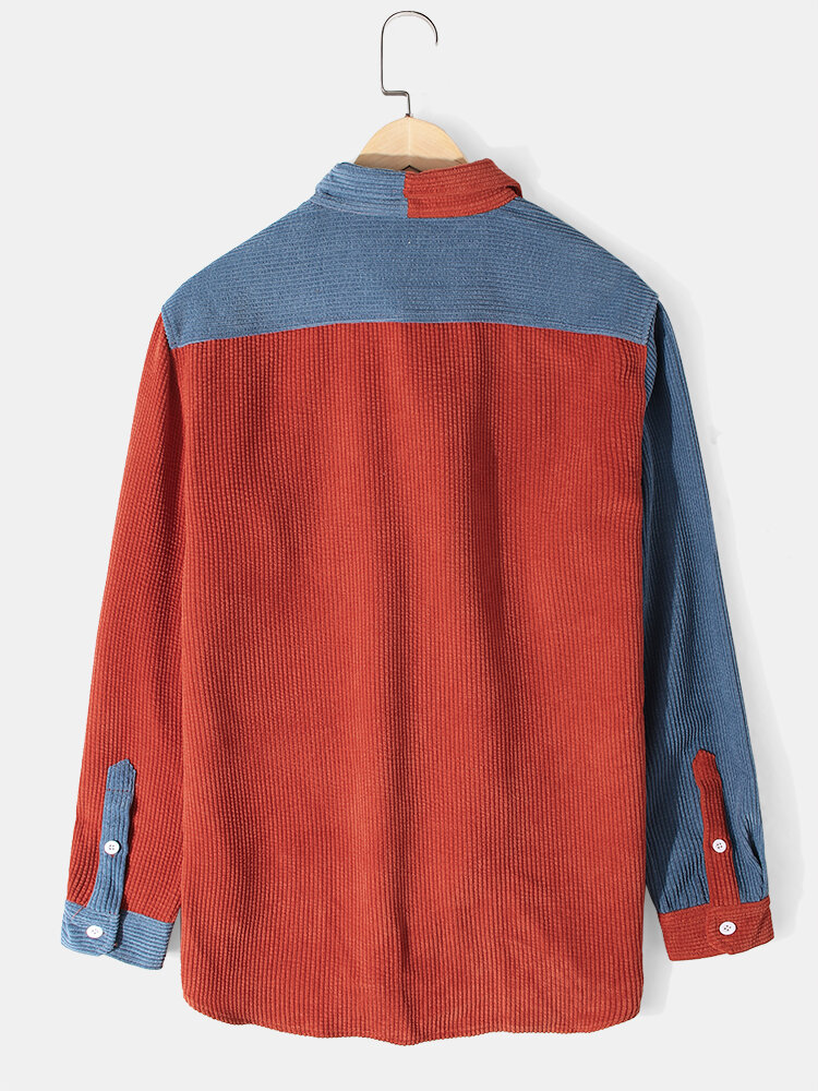 Mens Patchwork Corduroy Double Pocket Long Sleeve Design Shirts – Blue S