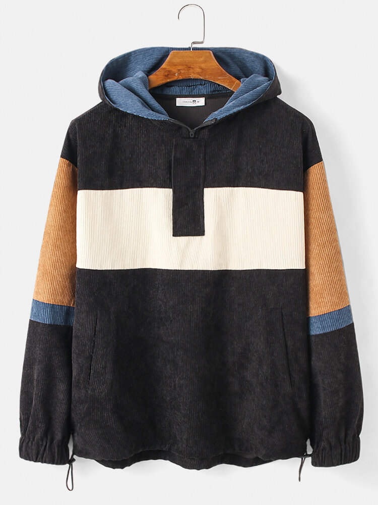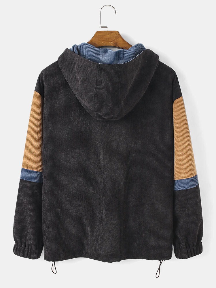 Mens Patchwork Corduroy Drop Shoulder Casual Hoodies With Pocket – Black S