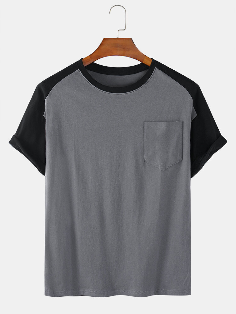 Mens Patchwork Cotton Crew Neck Loose Casual Short Sleeve T-Shirts With Pocket – Dark Grey L