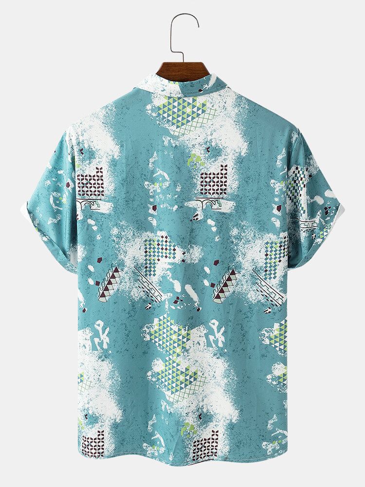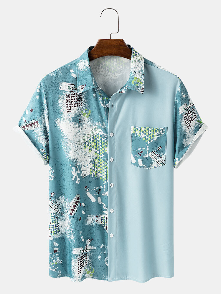 Mens Patchwork Double Patterns Mix Print Short Sleeve Casual Shirts – Blue S