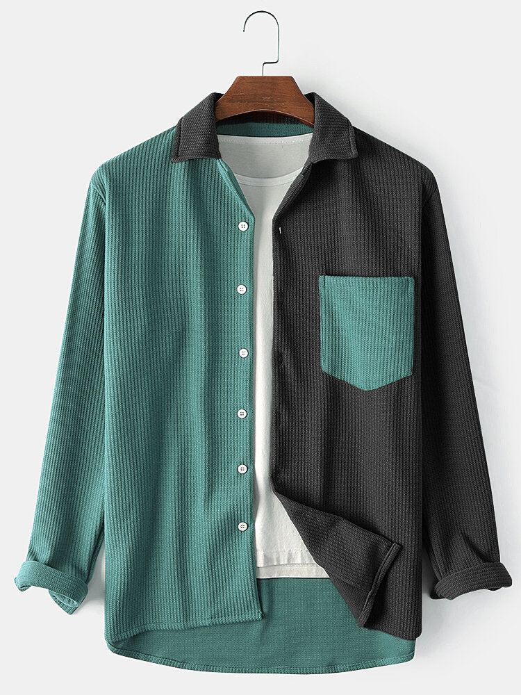 Mens Patchwork Knitting Jacquard Texture Button Up Long Sleeve Shirts With Pocket – Army Green S