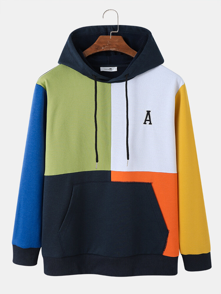 Mens Patchwork Multi Color Letter A Embroidery Kangaroo Pocket Hoodies – Blue S