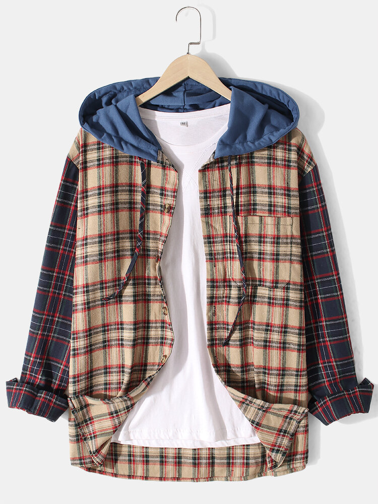 Mens Patchwork Plaid Chest Pocket Vintage Hooded Shirts – Khaki S