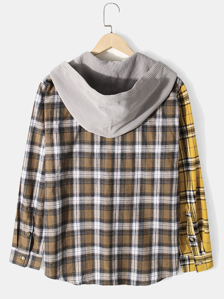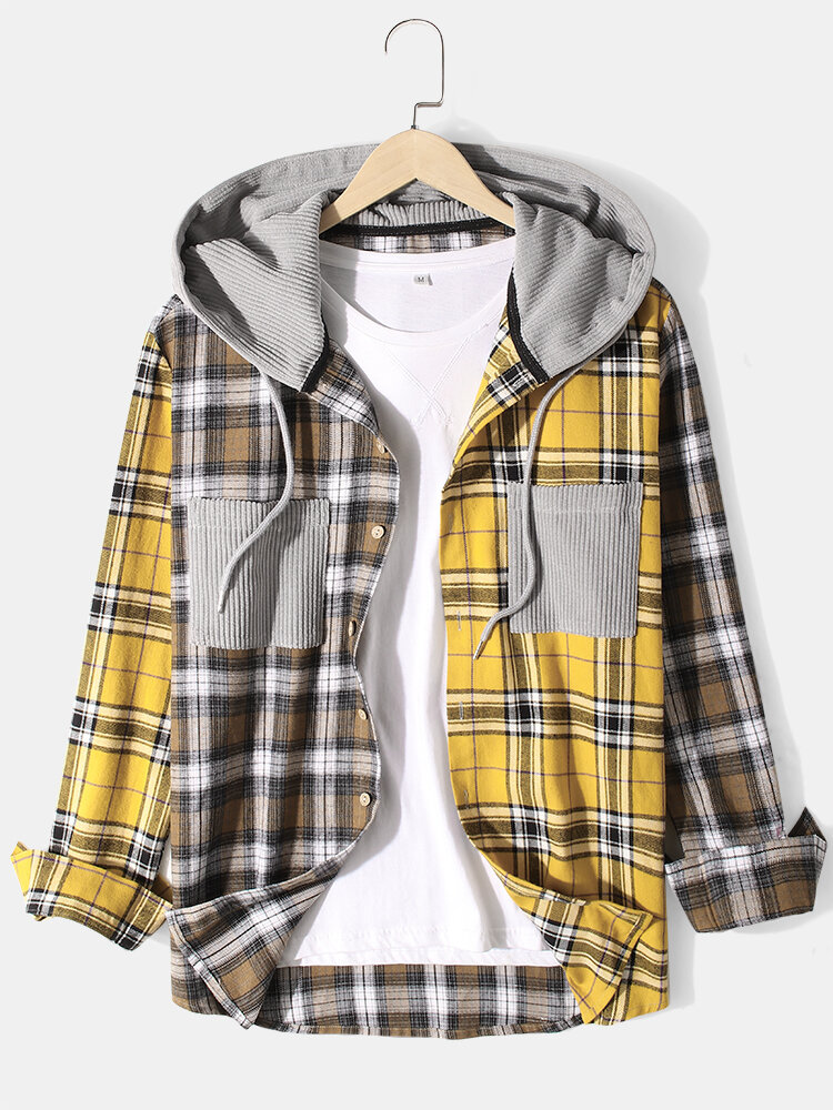 Mens Patchwork Plaid Cotton Double Pocket Casual Long Sleeve Drawstring Hooded Shirts – Yellow S