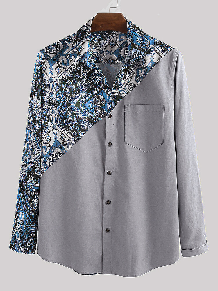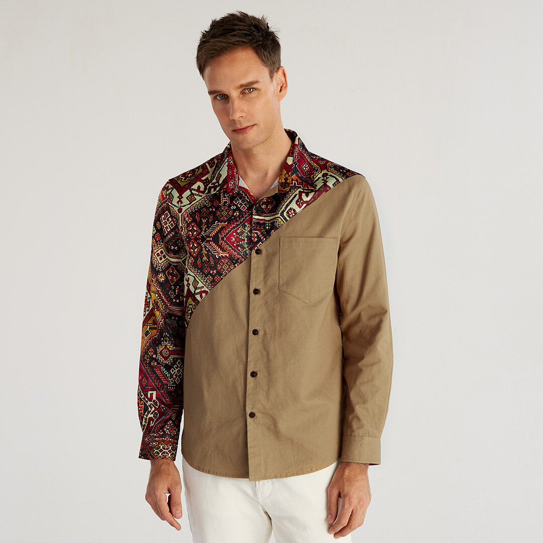 Mens Patchwork Printed Ethnic Style Chest Pocket Long – M Khaki