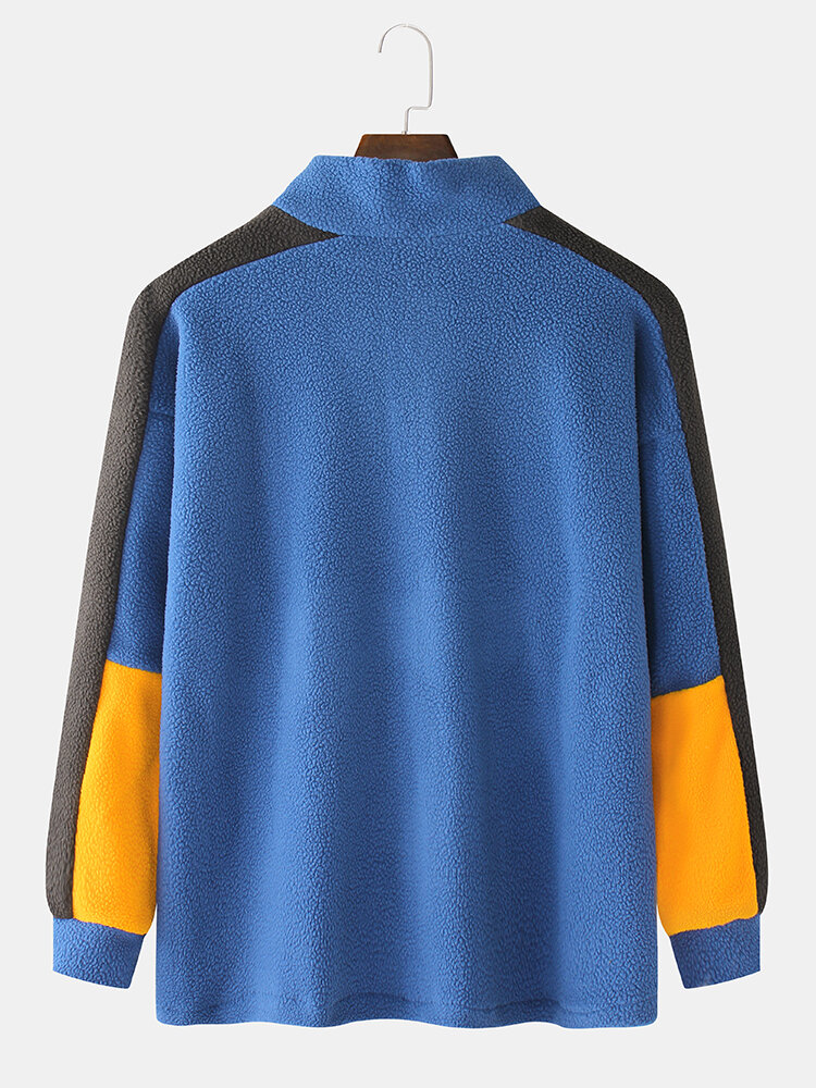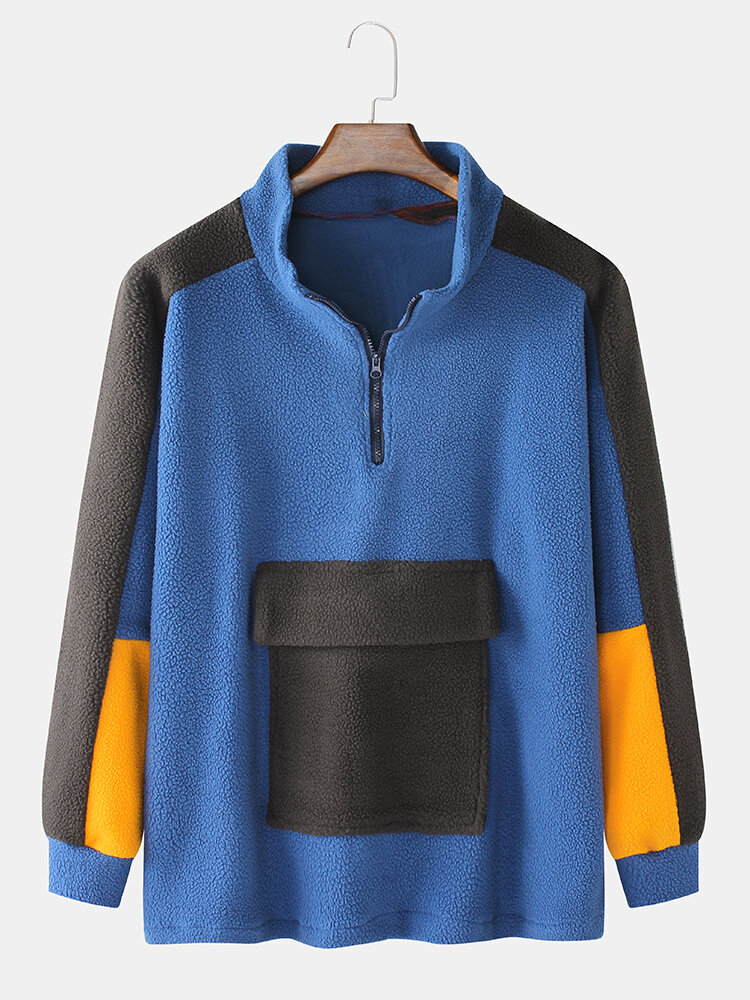 Mens Patchwork Raglan Sleeve Front Flap Pocket Thick Fleece Cotton Half Zipper Sweatshirt – Blue 3XL