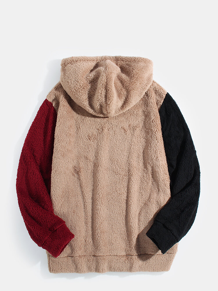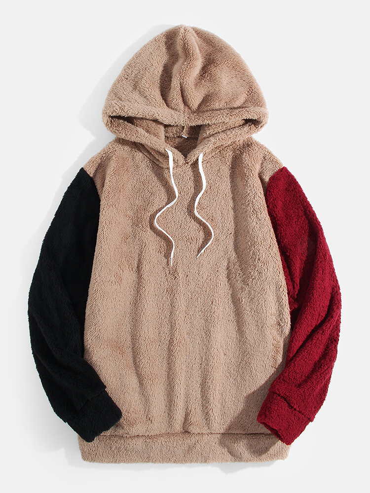 Mens Patchwork Soldi Color Plush Fluffy Long Sleeve Teddy Hoodies – Khaki S