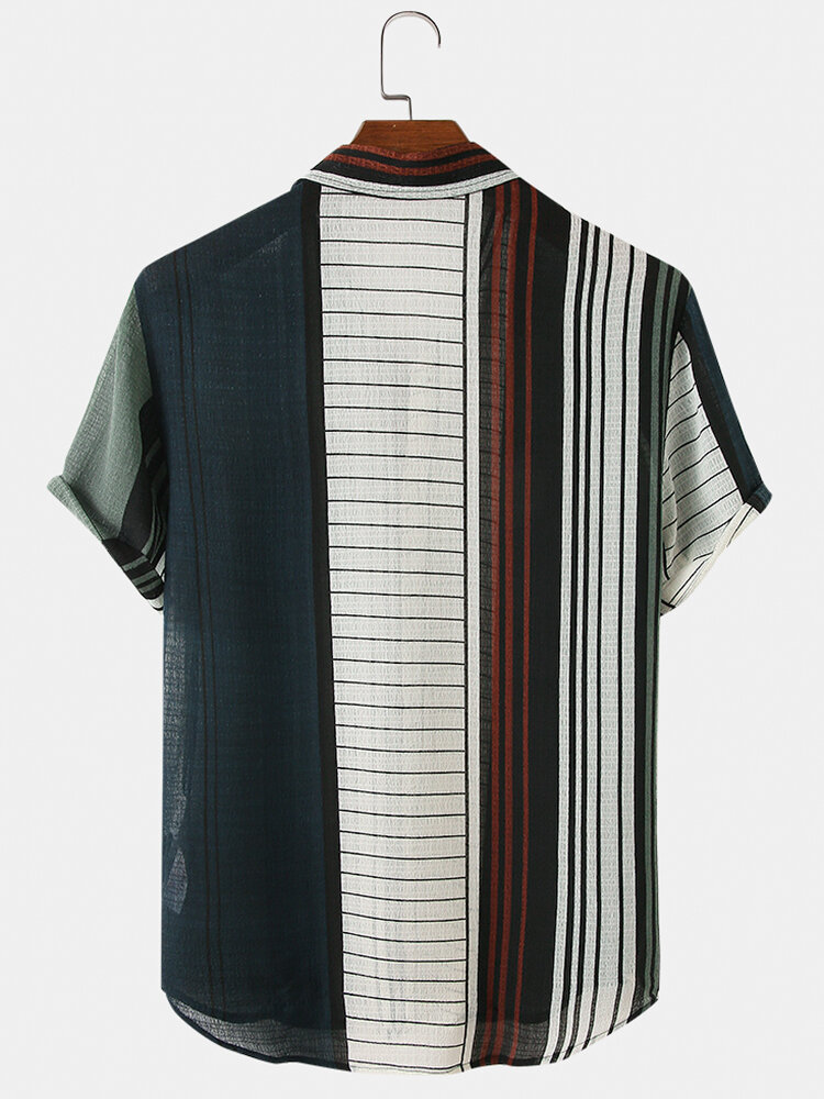 Mens Patchwork Srtiped Turn Down Collar Short Sleeve Shirts – Grey 2XL