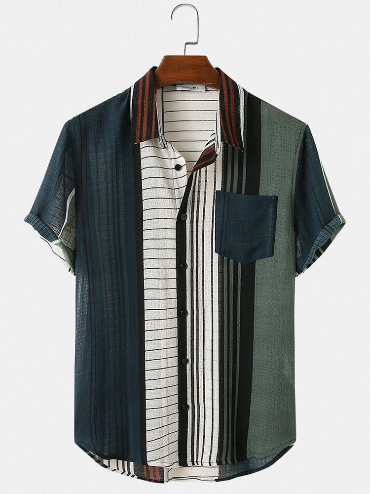 Brand:ChArmkpRDecoration:Pocket,ButtonFit Type:Regular FitMaterial:PolyesterNeckline:LapelPattern Type:Striped,PatchworkScene:Leisure,Home,CasualSeason:Spring,Summer,AutumnSize:XXL,L,S,XL,MSleeve:Short SleeveStyle:CasualThickness:Regular