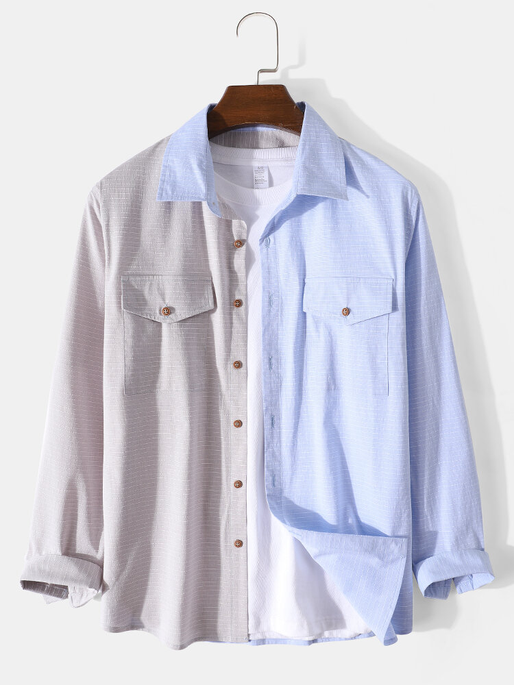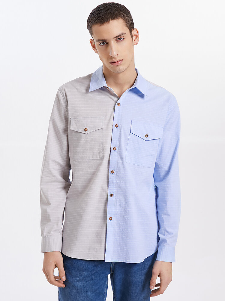 Mens Patchwork Striped Lapel Cotton Long Sleeve Shirts With Flap Pocket – Blue S