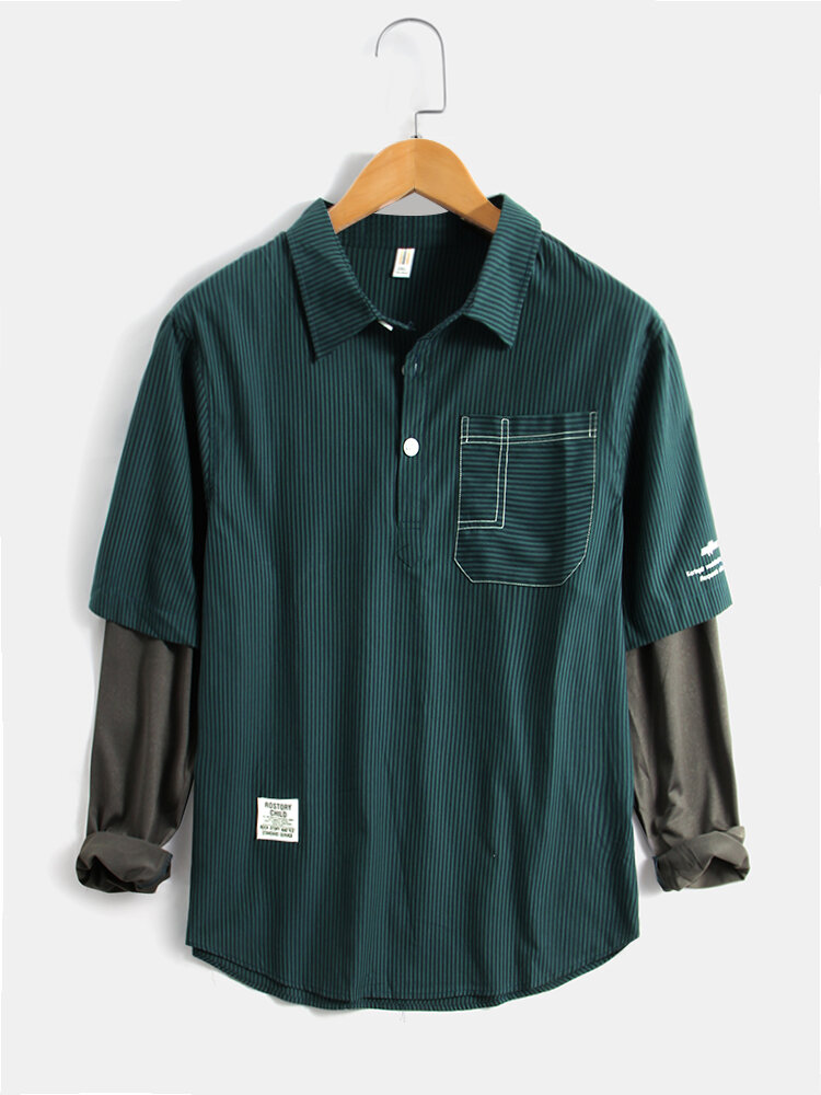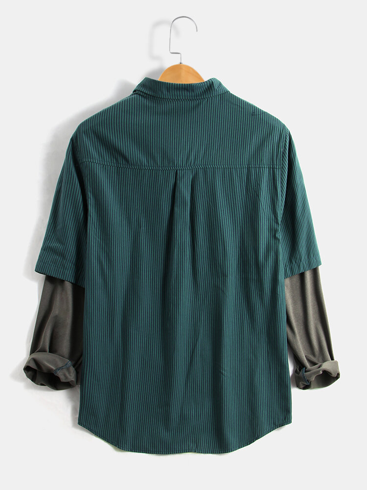Mens Pinstripe Lapel Patchwork Doctor Sleeve Cotton Casual Long Sleeve T-Shirts – Blue XL