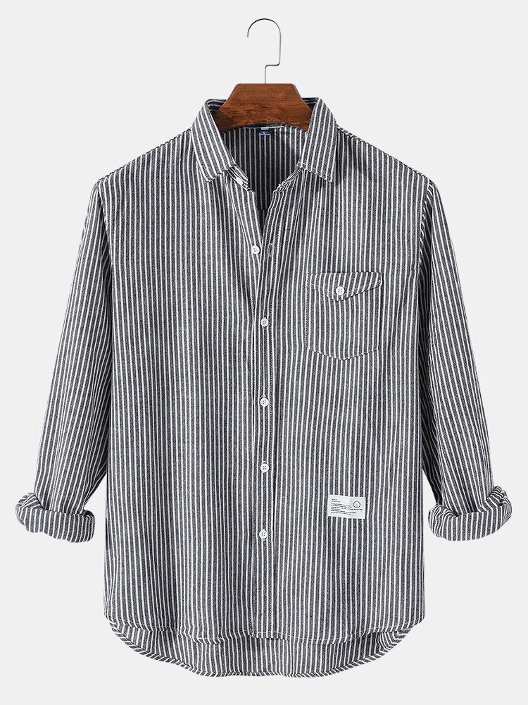 Mens Pinstripe Logo Cotton Casual Long Sleeve Shirts With Flap Pocket – Grey L