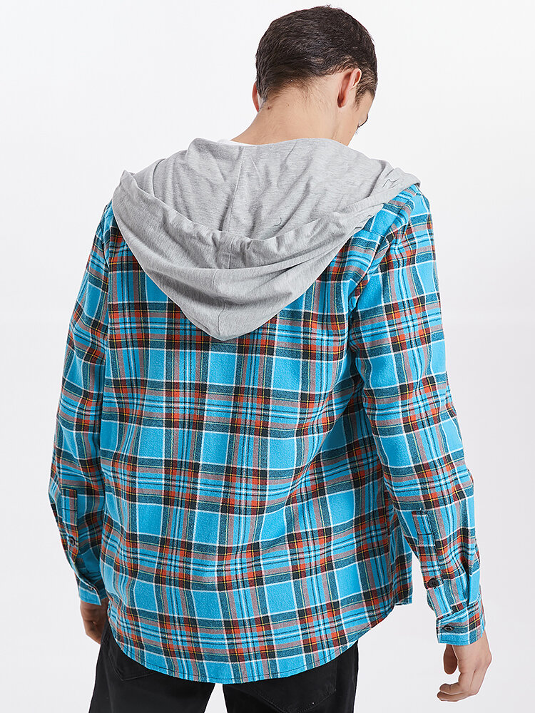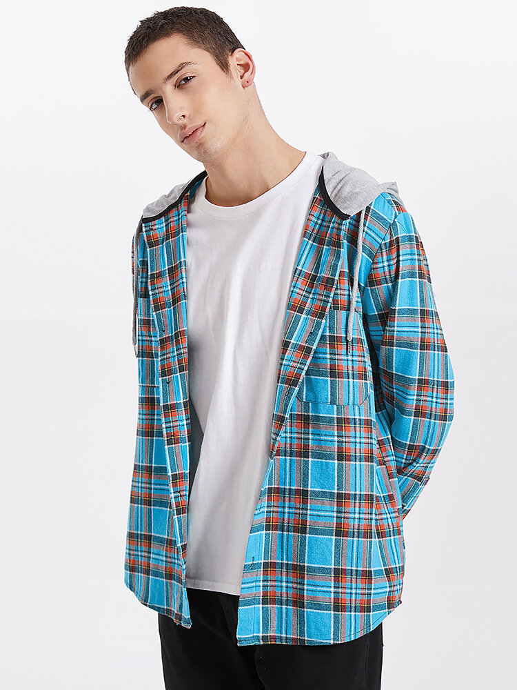 Mens Plaid Button Up 100% Cotton Casual Long Sleeve Hooded Shirts – Sky Blue S