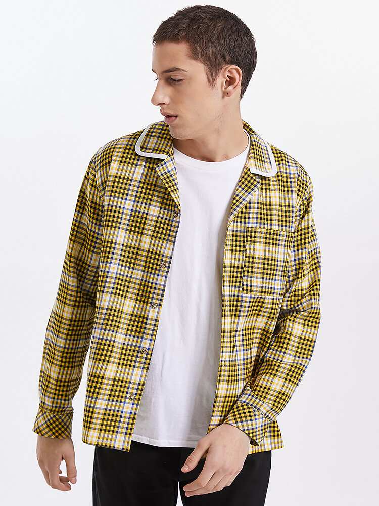 Mens Plaid Contrast Revere Collar Cotton Long Sleeve Shirts – Yellow S