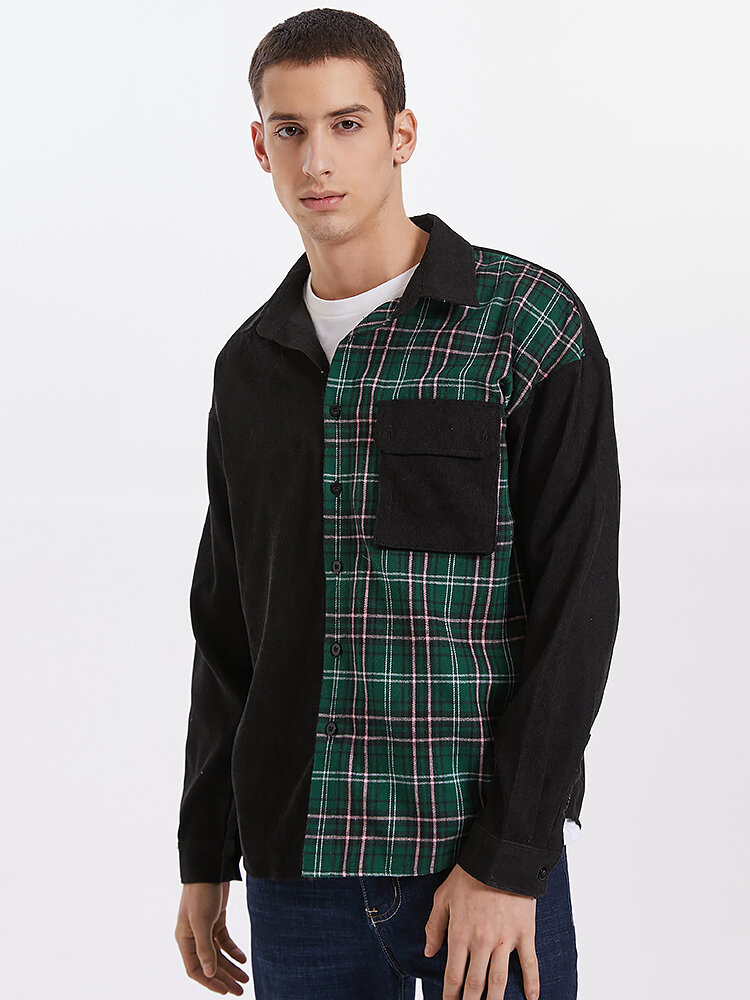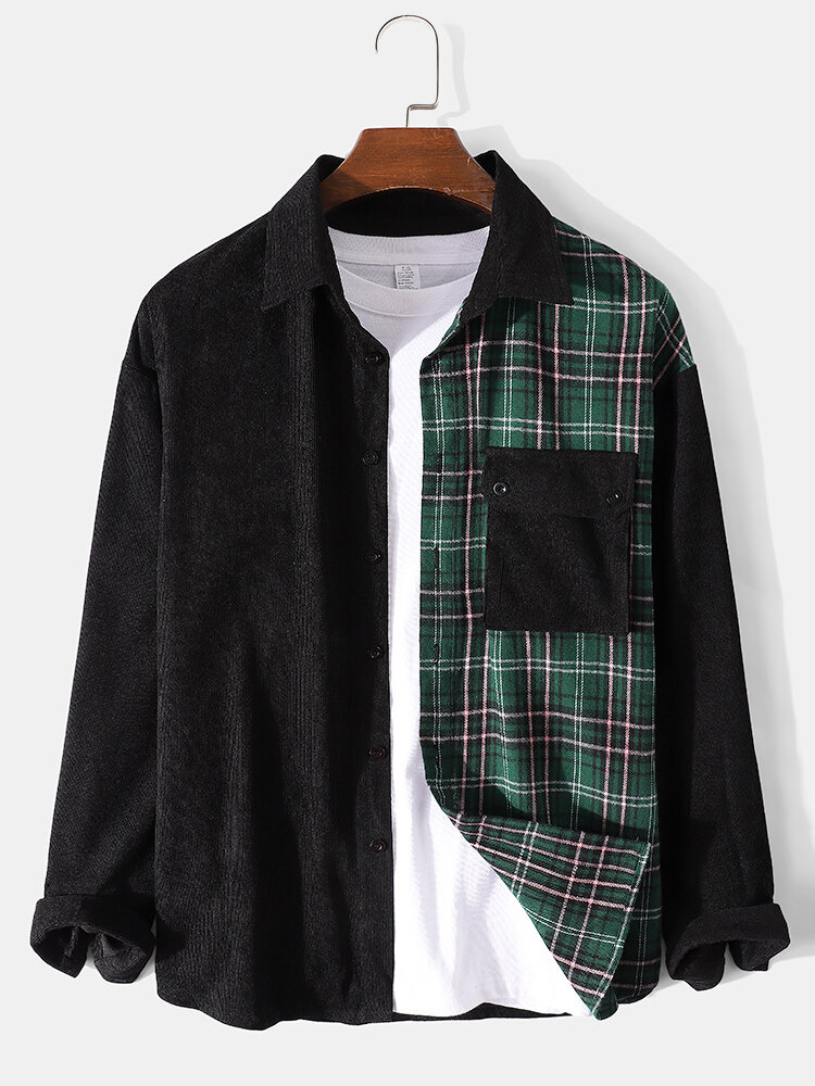 Mens Plaid Corduroy Patchwork Button Up Long Sleeve Shirts With Flap Pocket – Black S