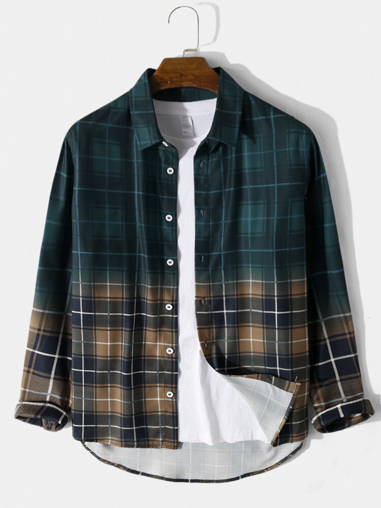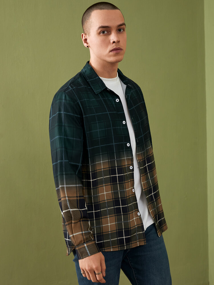 Mens Plaid Gradient Button Up Contrast Color Shirt – Green S