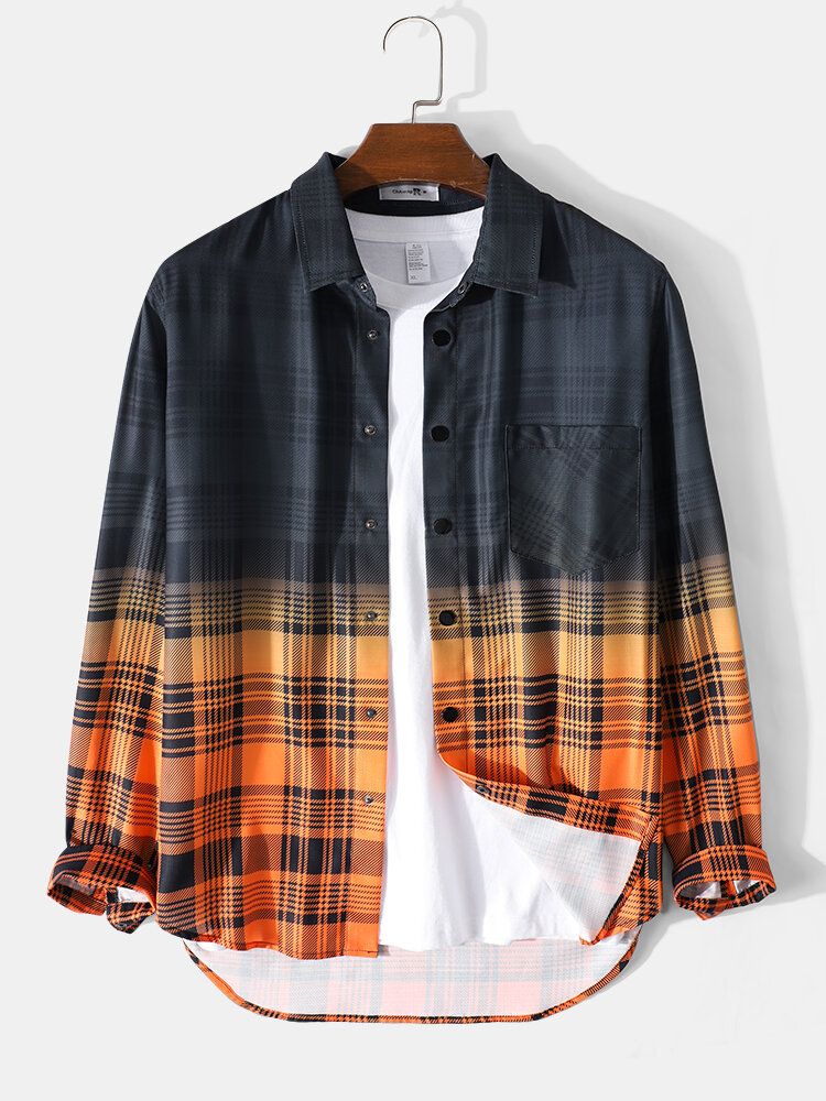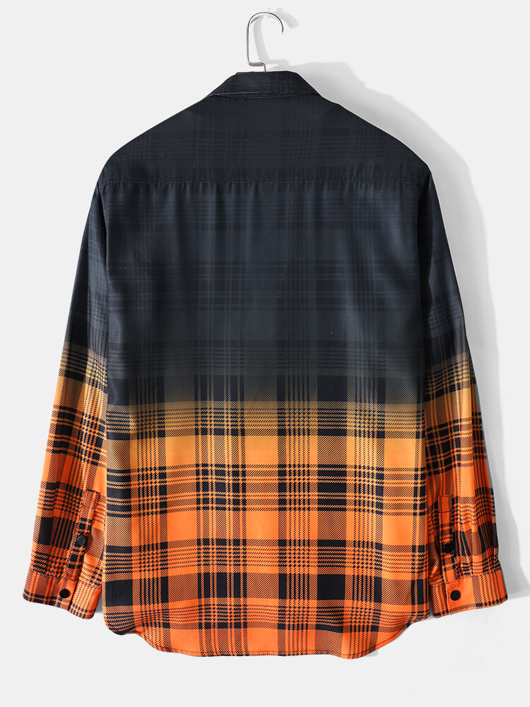 Mens Plaid Ombre Lapel Chest Pocket Casual Long Sleeve Shirts – Orange 2XL