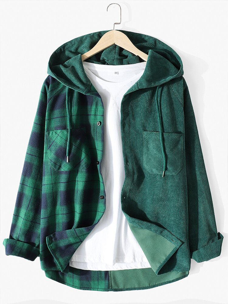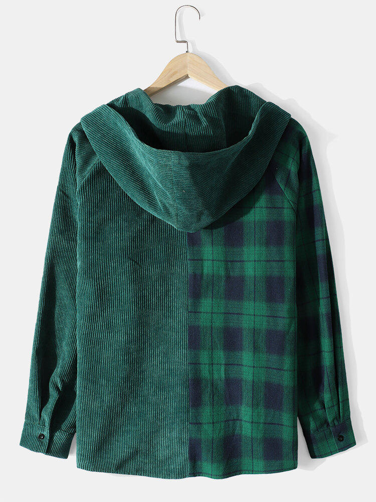 Mens Plaid Patchwork Button Up Hooded Shirts – L Green