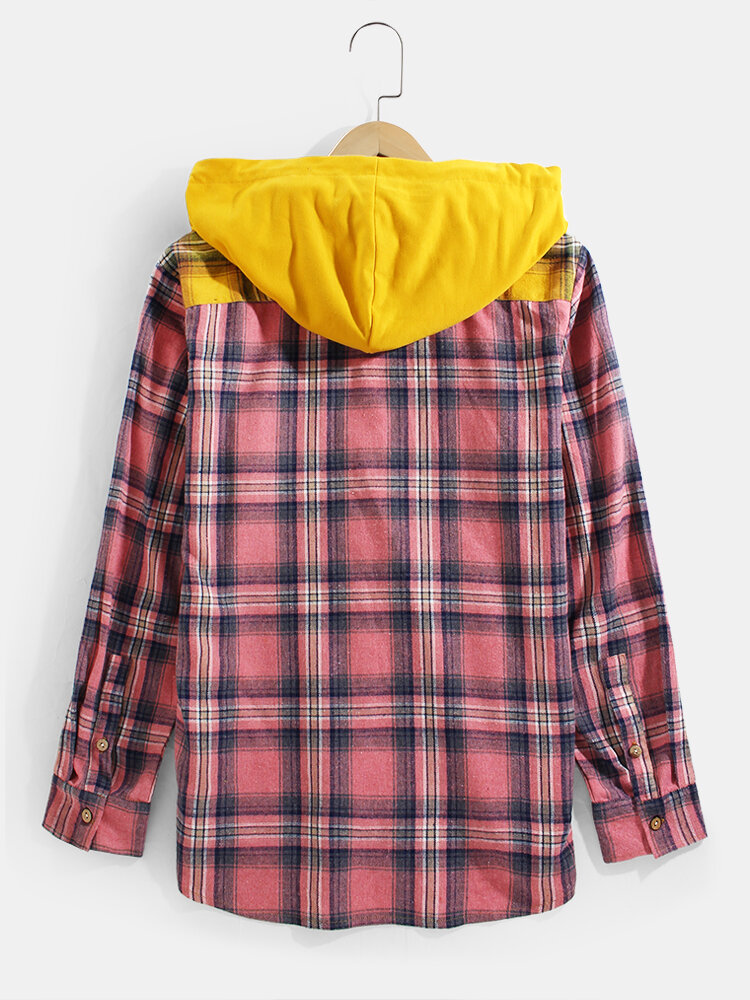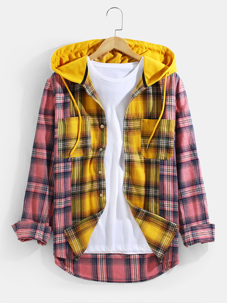 Mens Plaid Patchwork Button Up Long Sleeve Hooded Shirts With Double Pocket – Yellow S