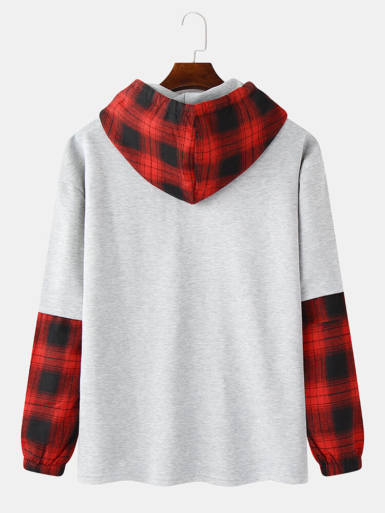 Mens Plaid Patchwork Faux Twinset Drop Shoulder Hoodies With Pocket – Black S