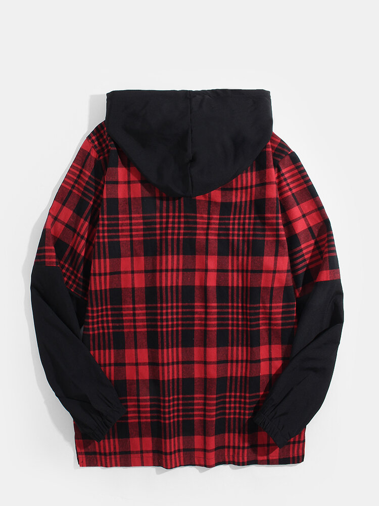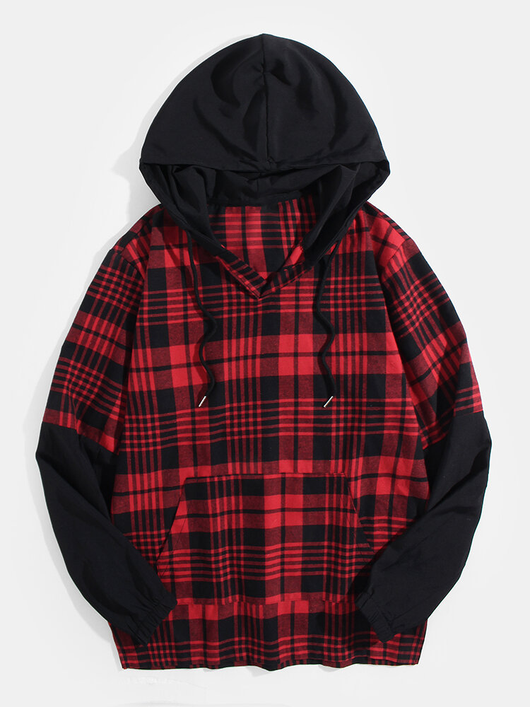 Mens Plaid Patchwork Faux Twinset Kangaroo Pocket Hoodies – Red M