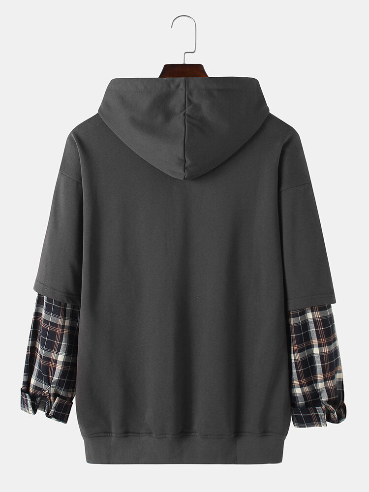 Mens Plaid Patchwork Faux Twinset Pullover Hoodie With Chest Pocket – White L