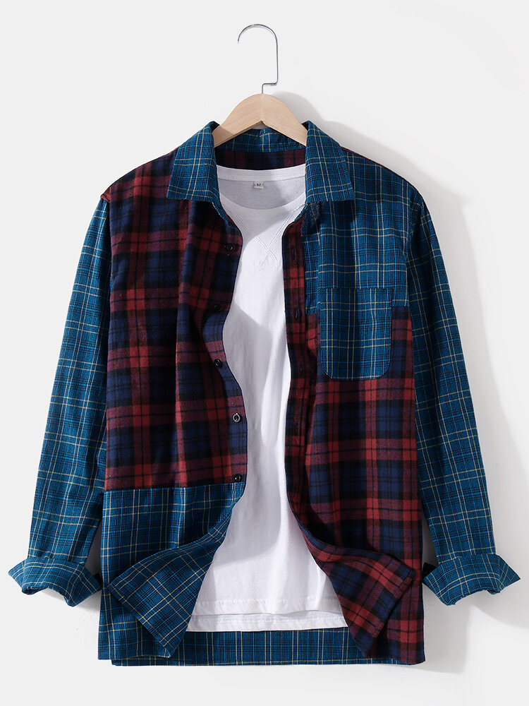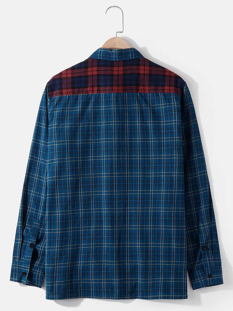 Mens Plaid Print Chest Pocket Long Sleeve Colorblock Shirts – Blue S