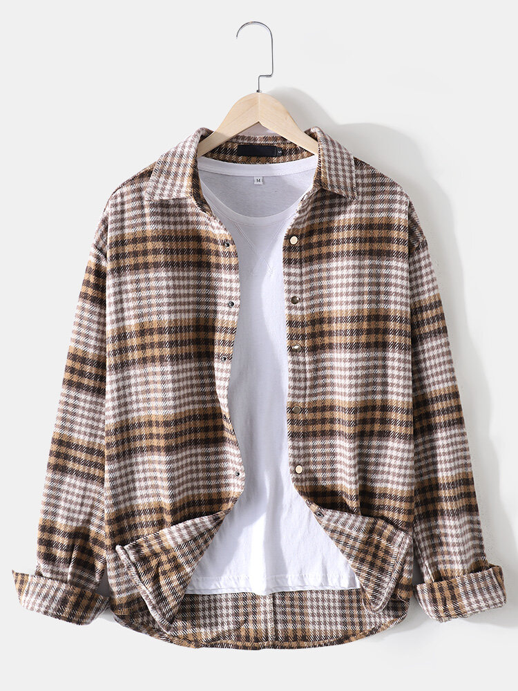 Mens Plaid Print Lapel Button Up Long Sleeve Vintage Shirts – Yellow S