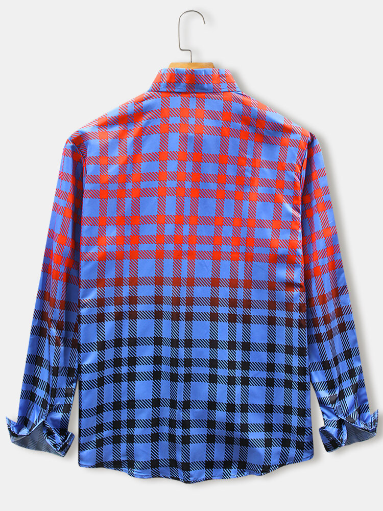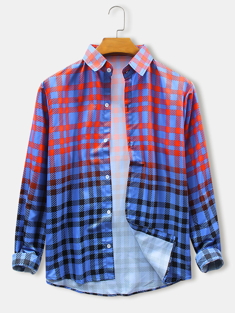 Mens Plaid Print Lapel Collar Long Sleeve Gradient Casual Shirts – Green M