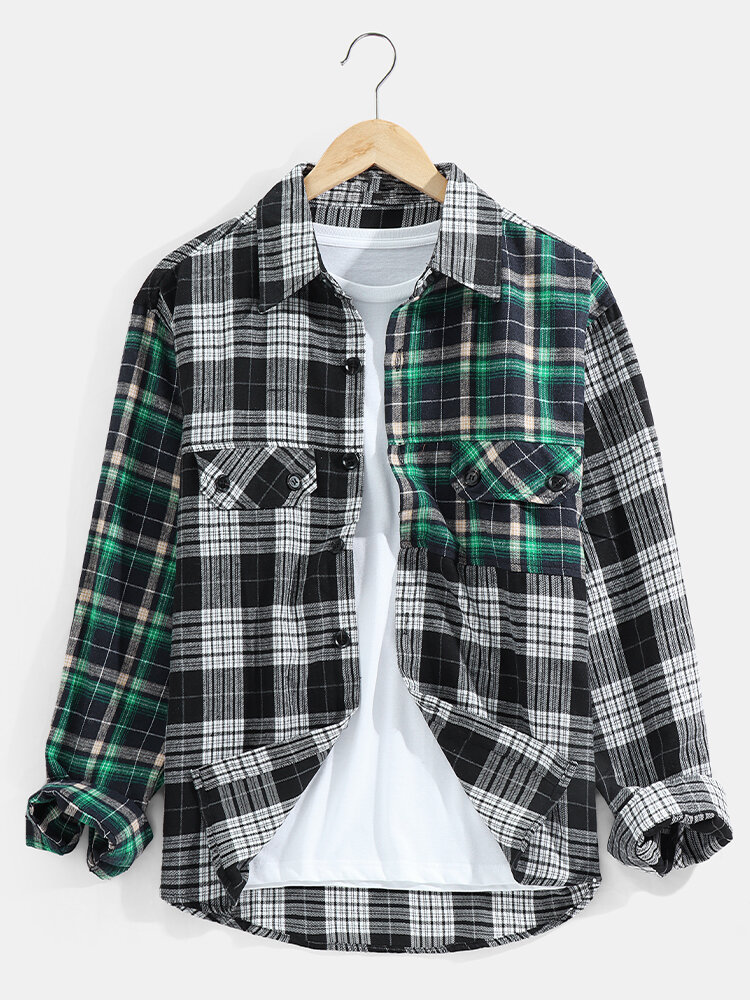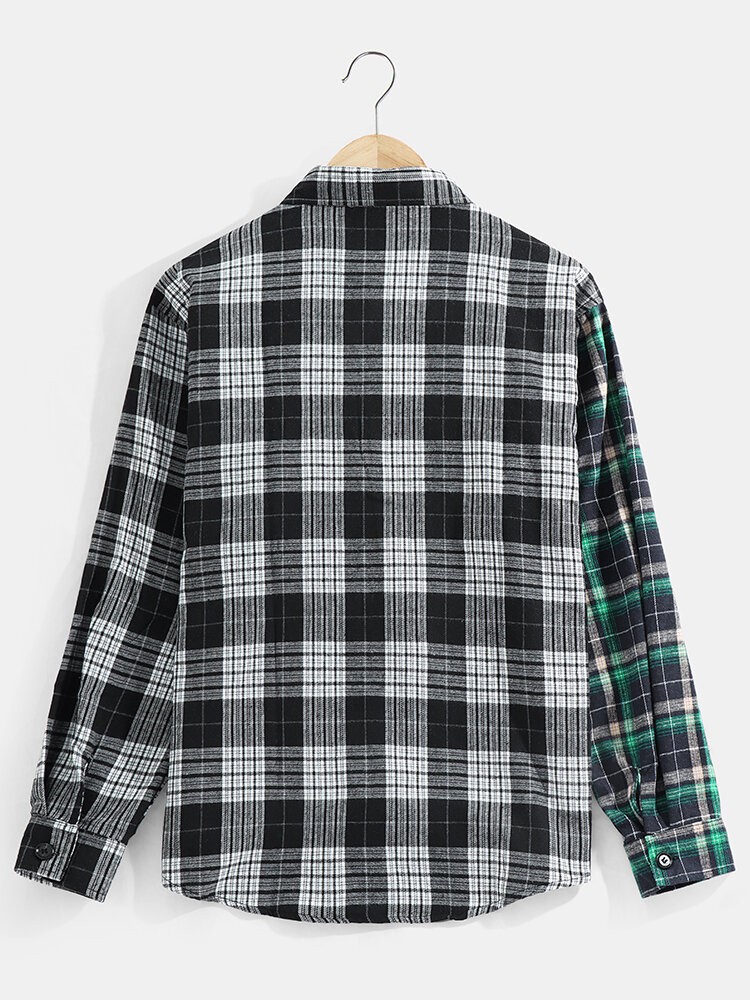 Mens Plaid Print Patchwork Double Pockets Long Sleeve Casual Shirt – Black L
