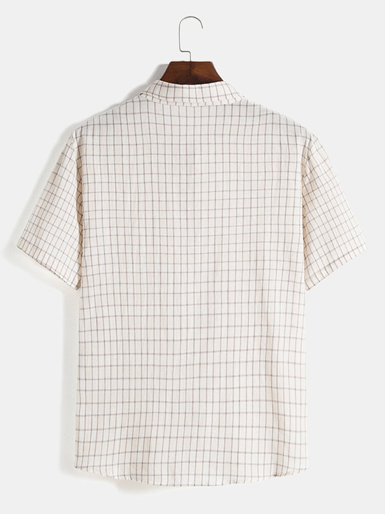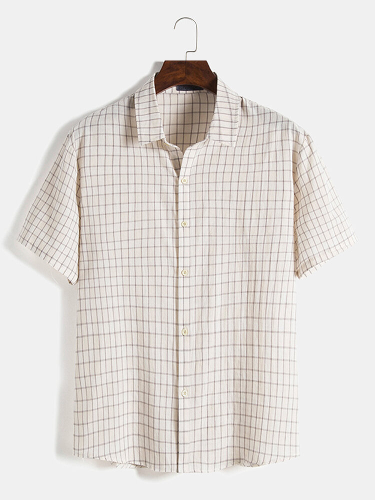 Mens Plaid Print Turn Down Collar Short Sleeve Shirts – Khaki S