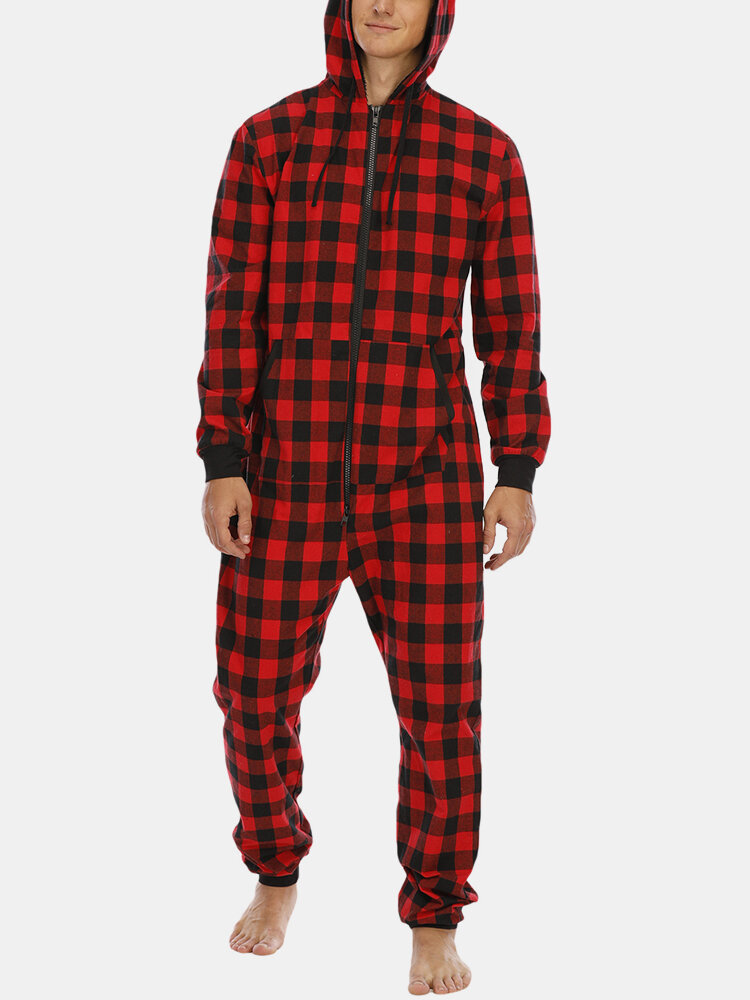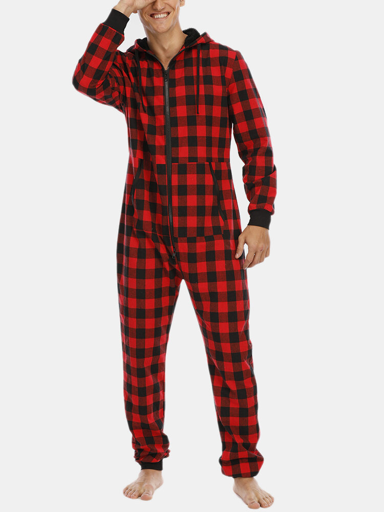 Mens Plaid Zipper Front Kangaroo Pocket Hooded One Piece Jumpsuit Home Warm Sleepwear – Red M