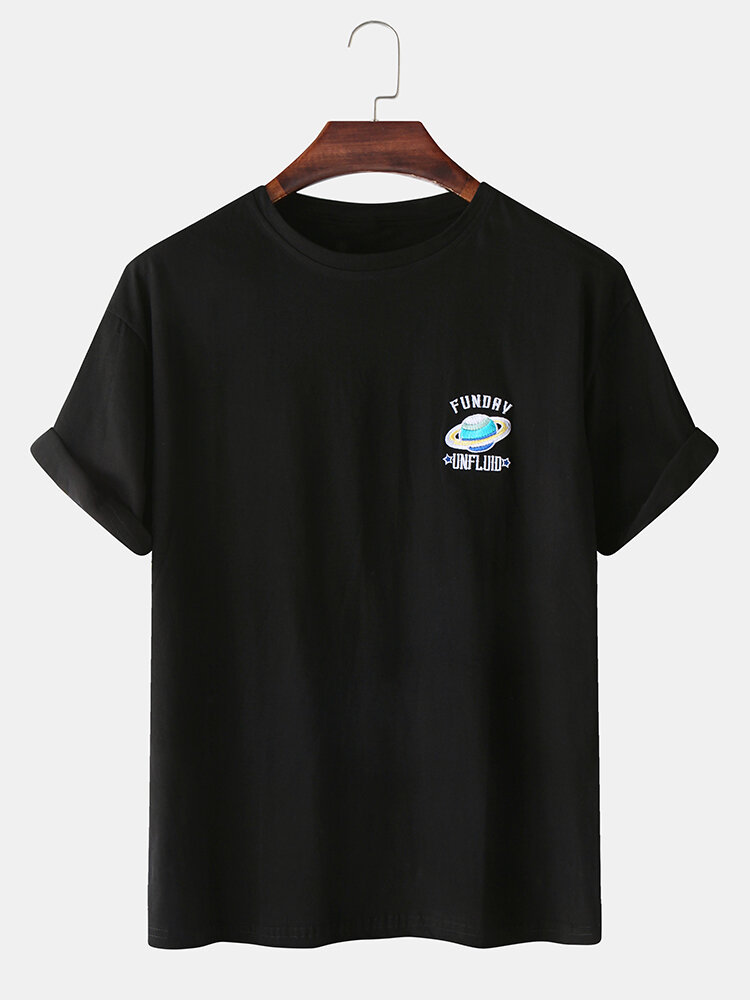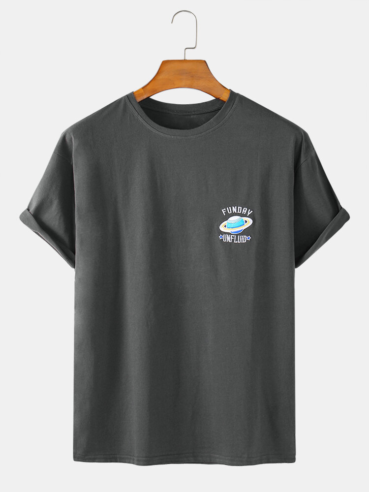 Mens Planet Letter Embroidery Cotton Round Neck Casual Short Sleeve T-Shirts – White S