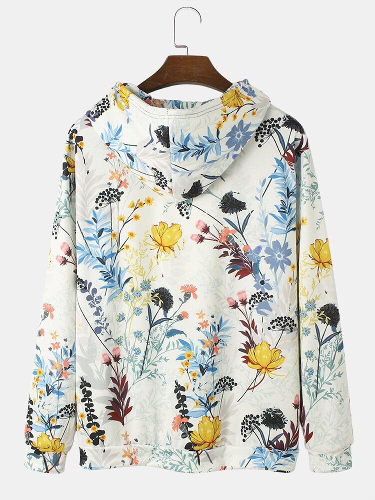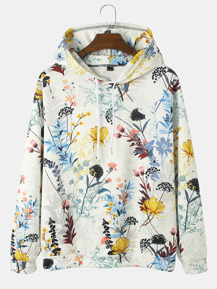 Mens Plant Floral Print Kangaroo Pocket Street Drawstring Hoodies – White M