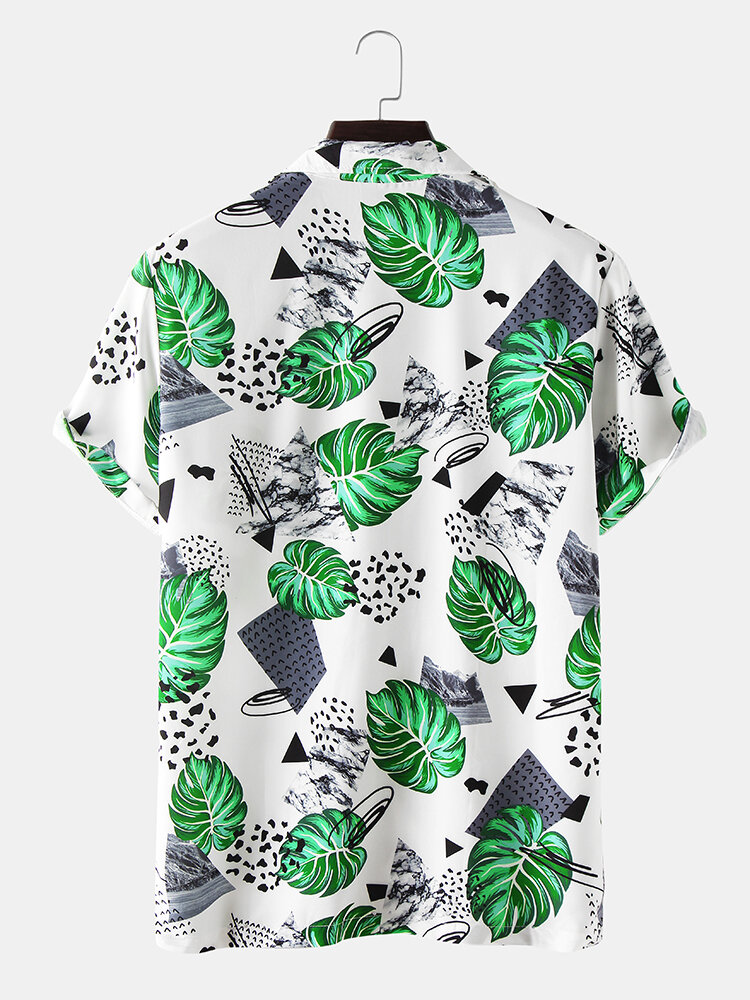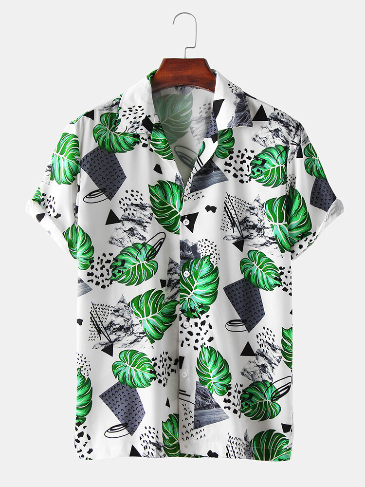 Mens Plant Leaf Printed Light Casual Revere Collar Short Sleeve Shirts – Green M