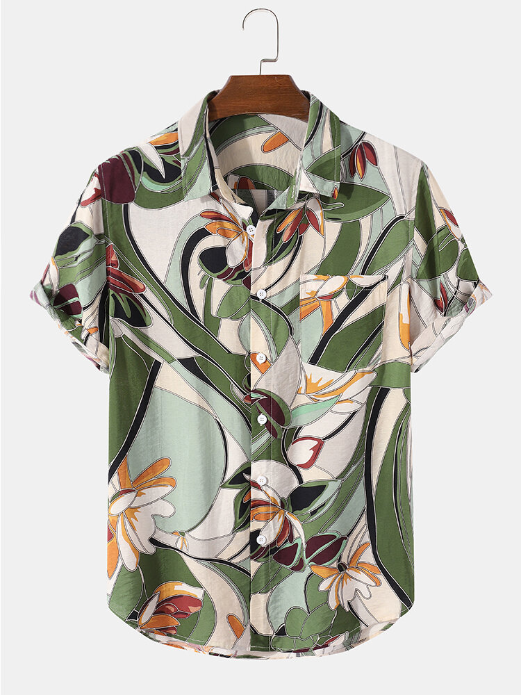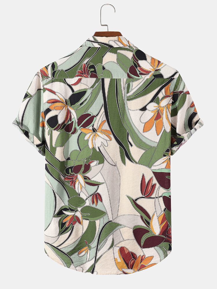 Mens Plants Floral Holiday Print Lapel Short Sleeve Casual Shirts – Green S
