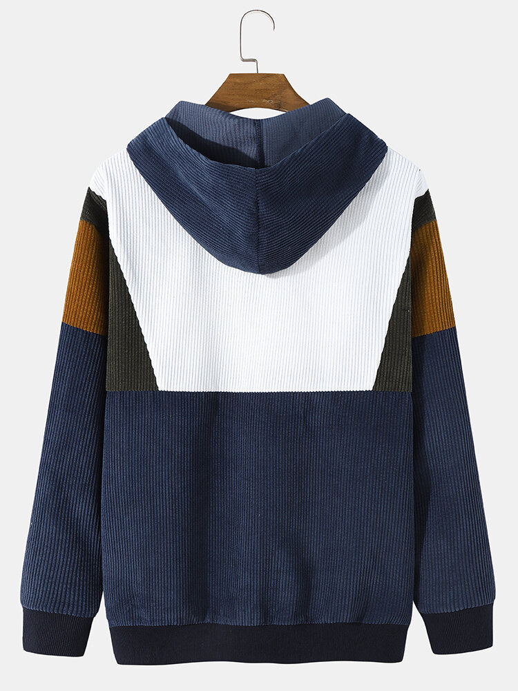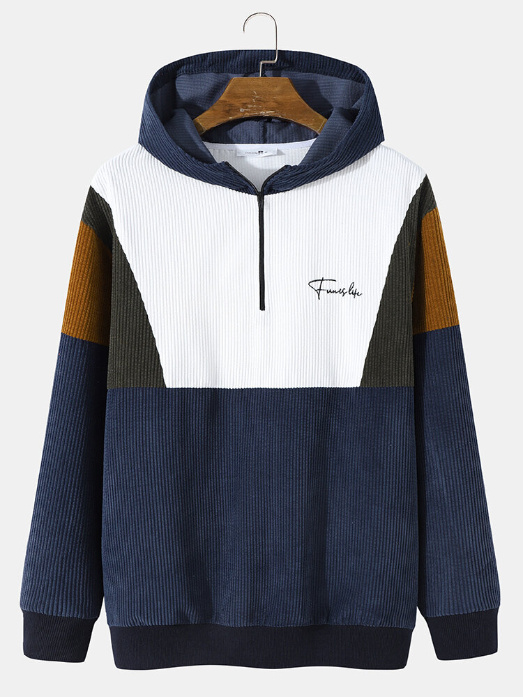Mens Preppy Style Color Block Half-Zip Corduroy Hooded Sweatshirt – Blue S