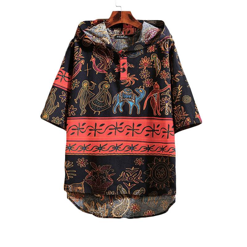 Mens Printed Half Sleeve Hoodies T-shirt Loose Causal Pullover Tee Tops Outdoor Camping Hiking – Yellow S