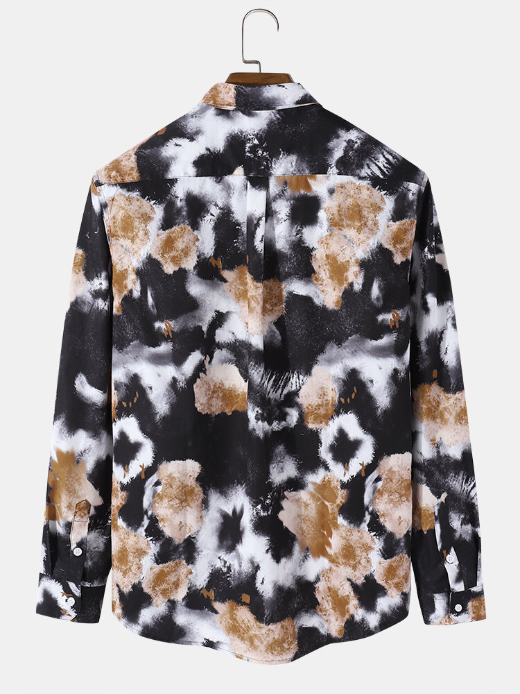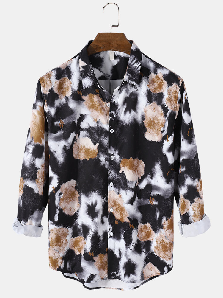 Mens Printed Lapel Button Curve Botton Down Long Sleeve Casual Shirts – Black L