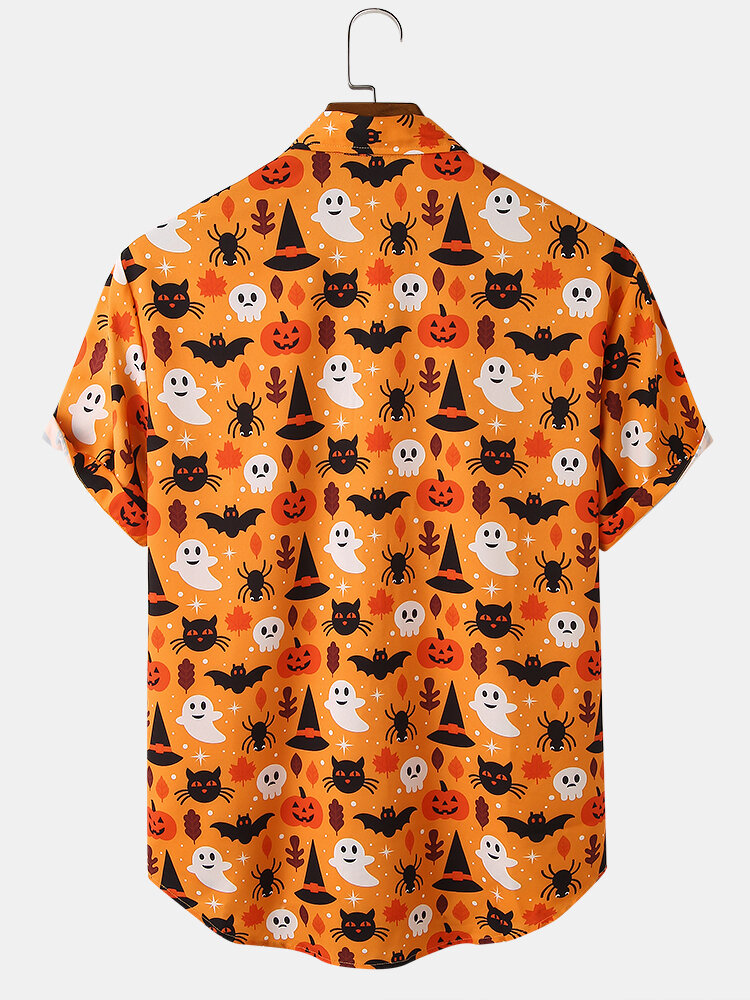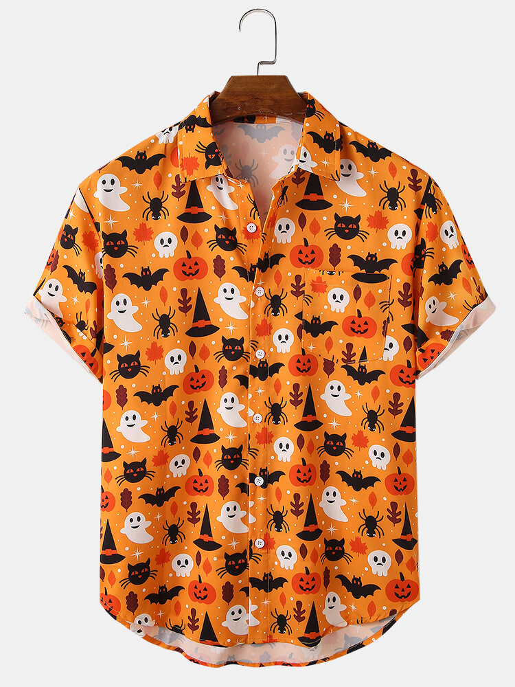 Mens Pumpkin Cartoon Button Down Casual Short Sleeve Shirts – Yellow S