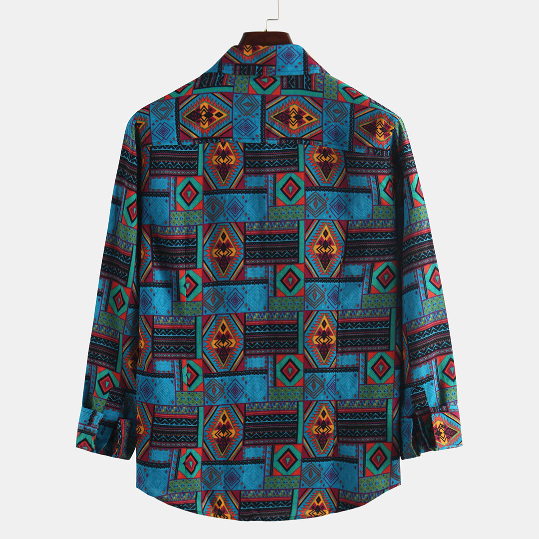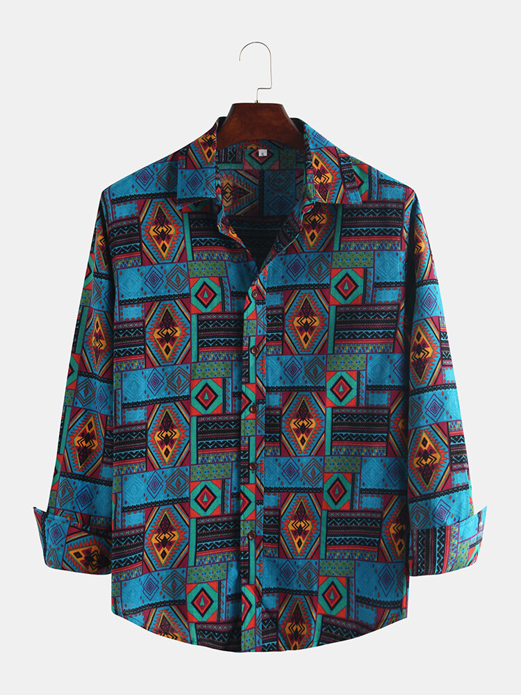 Mens Regular Geometry Printing Ethnic Style Long Sleeve Lapel Shirts – S Blue