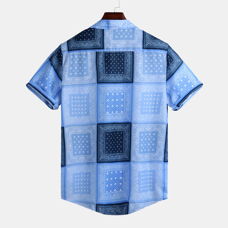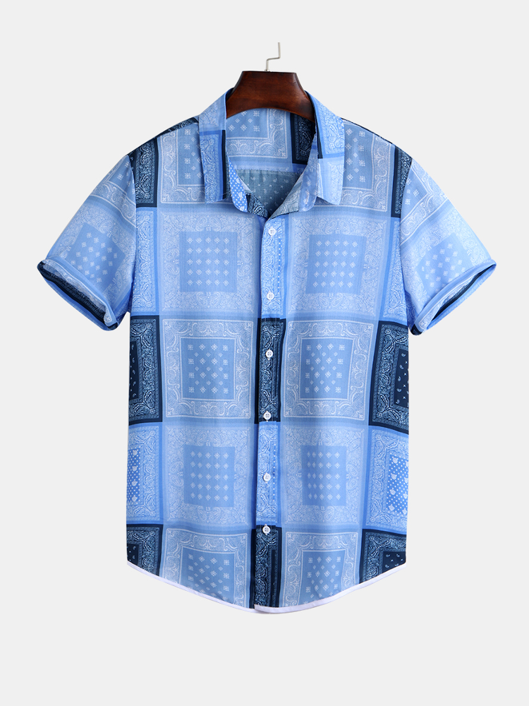 Mens Retro Geometric Printed Short Sleeve Casual Shirts – M Blue