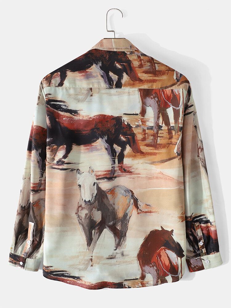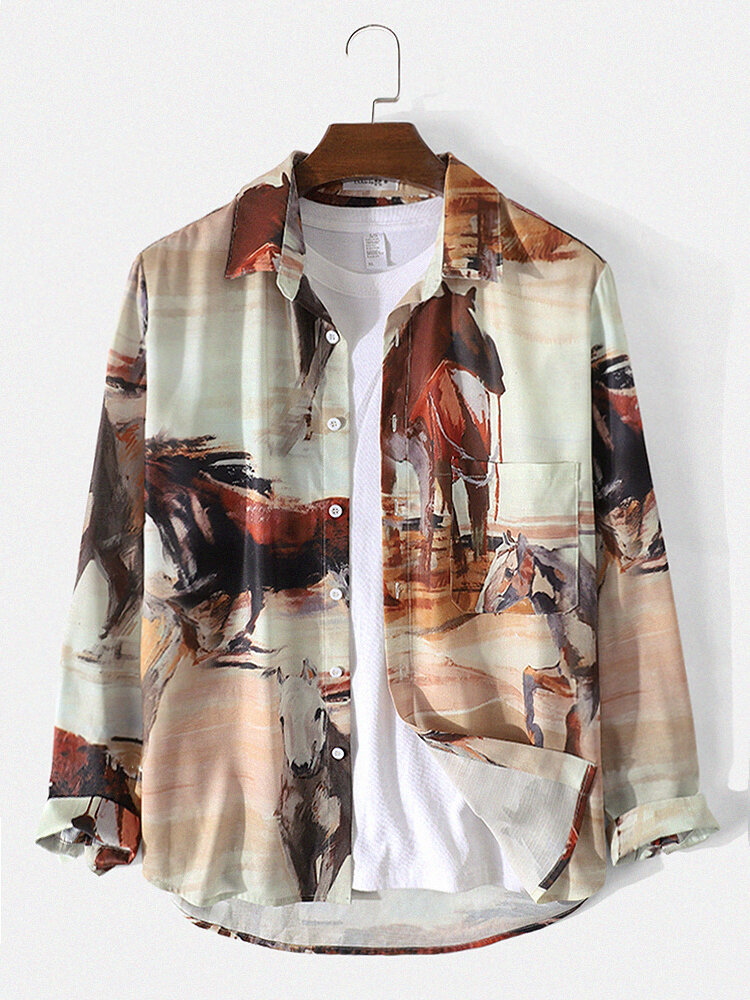 Mens Retro Painting Print Lapel Casual Long Sleeve Shirt – Apricot S