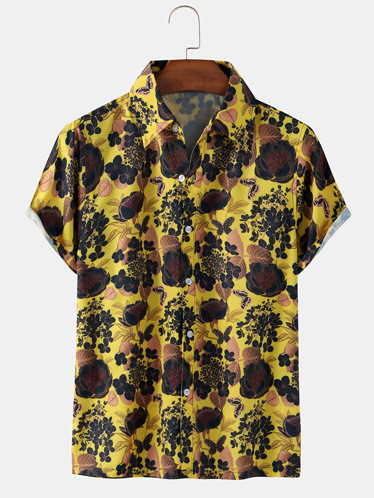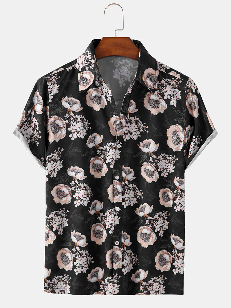 Mens Retro Vintage Floral Print Breathable & Thin Short Sleeve Shirts – Black L