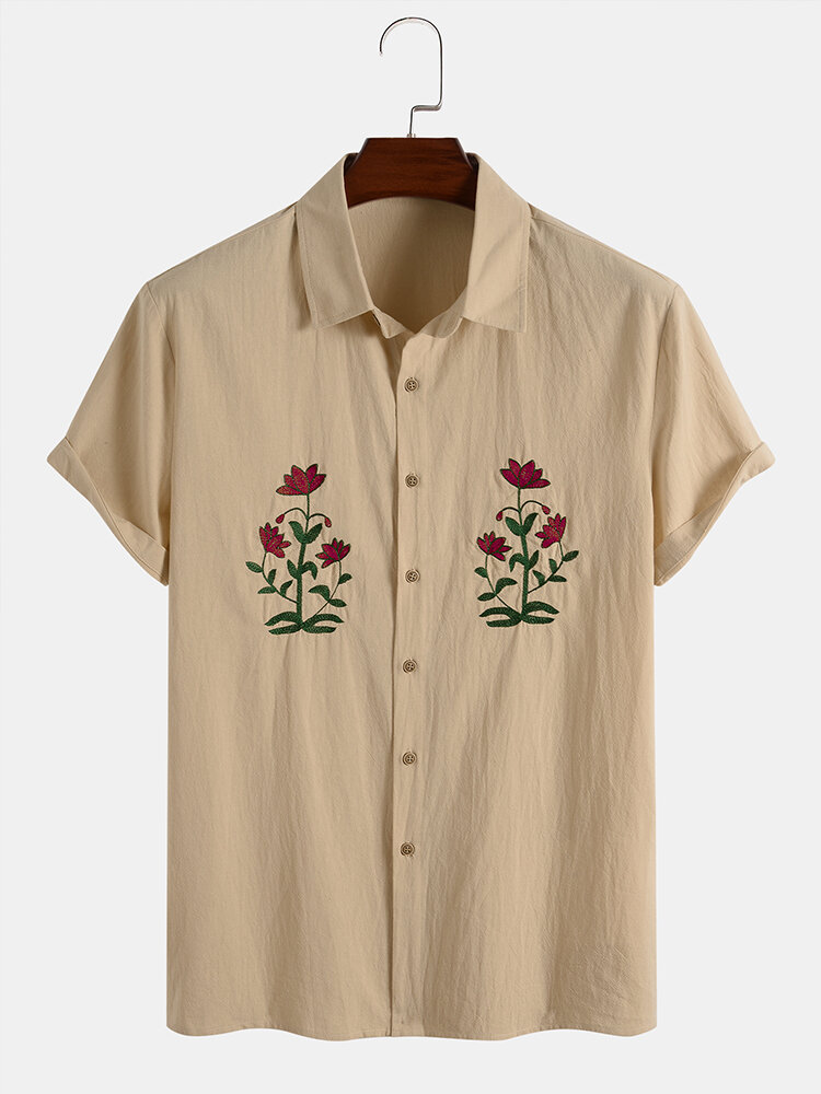 Mens Rose Embroidery 100% Cotton Casual Shirts – Khaki S
