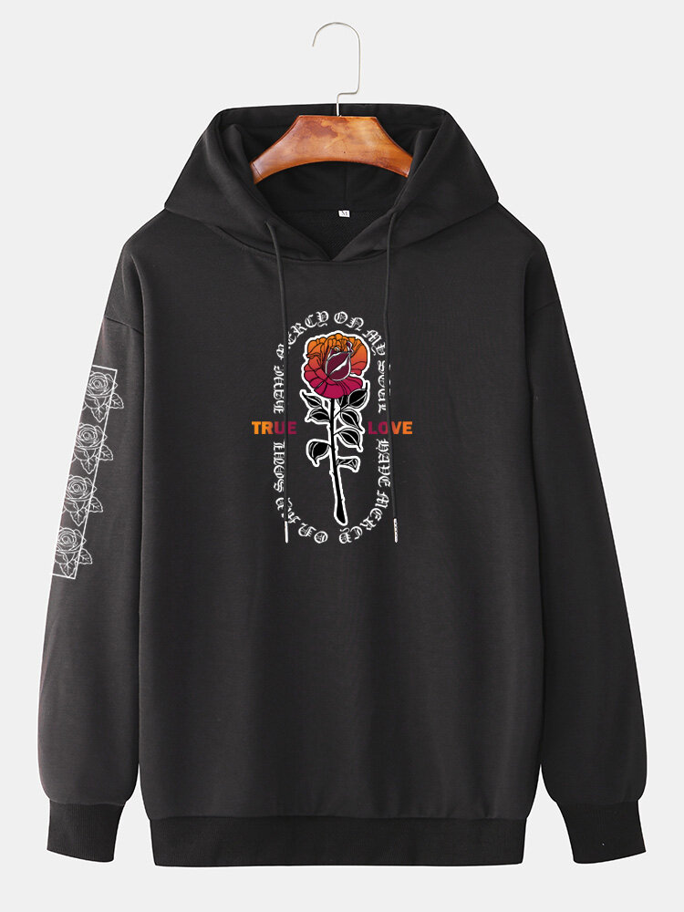 Mens Rose Letter Print Drop Shoulder Casual Drawstring Hoodies – Black M