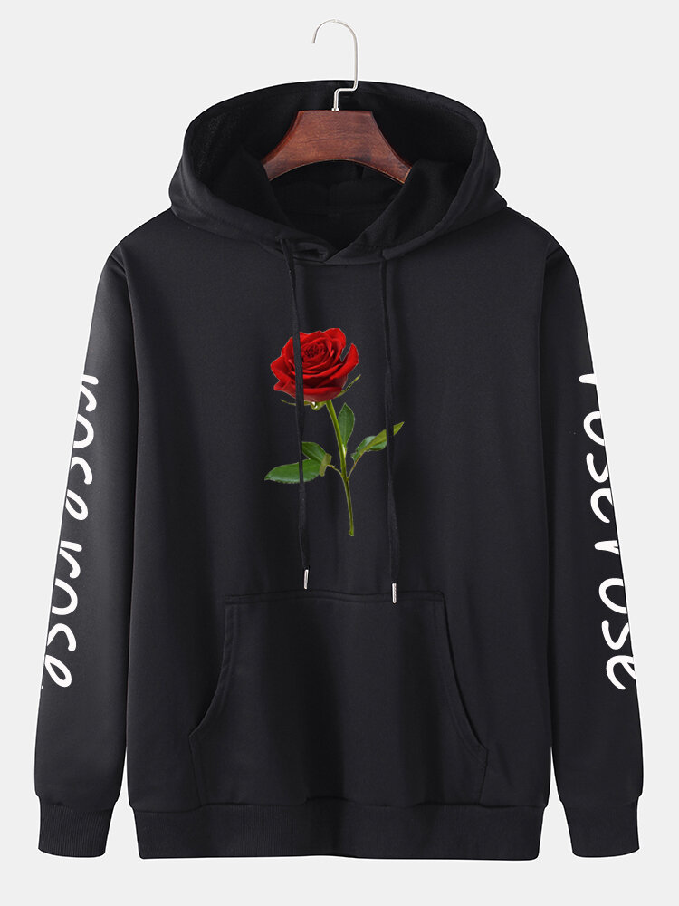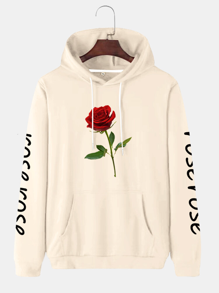 Mens Rose Letter Sleeve Print Cotton Drawstring Pullover Hoodies – Army Green M