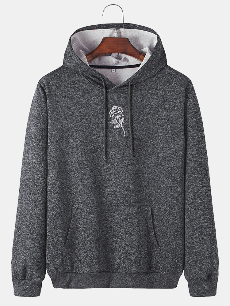 Mens Rose Print Simple Kangaroo Pocket Long Sleeve Hoodies – Wine Red XL