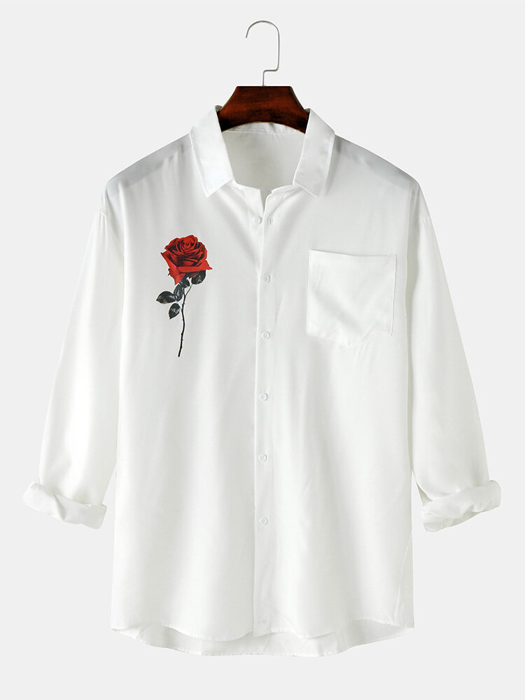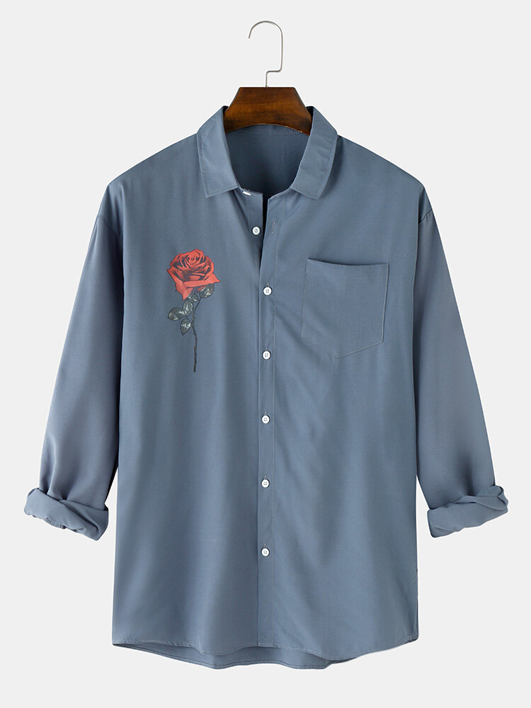 Mens Rose Printed Pocket Button Loose Vintage Shirt – Blue grey XL